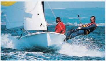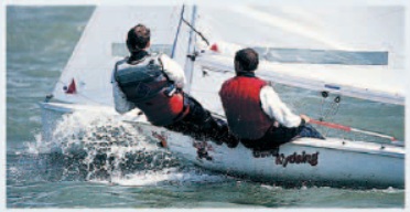 이 요트들은 상당한 강풍 속에서 선원들이 트라페즈에 매달린 채 경주하고 있다. 돛은 기울기 압력을 줄이기 위해 상당한 트위스트로 맞춰져있다.