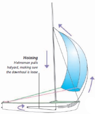 선장은 햘랴드를 당겨서 돛을 올리고, 선원은 쉬트와 가이를 해당 마크에 배치한 후 폴을 연결한다. 선장은 할랴드를 클리트에 묶은 다음 쉬트와 가이를 조정하고, 선원은 폴을 처리한다.