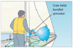 (1) 선원은 할랴드를 풀고 가이를 클리트에 묶어서 클루가 포스테이 앞으로 가게 한다. 스피내커를 파우치에서 꺼내 튼튼하게 잡는다.