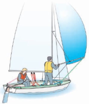 (3) 선장은 쉬트와 가이를 조절하고, 선원은 폴을 조절한다. 가이는 리칭 훅 밑에 끼워두거나, 트위닝 라인을 조정한 후 가이를 조정하고 클리트에 묶는다.