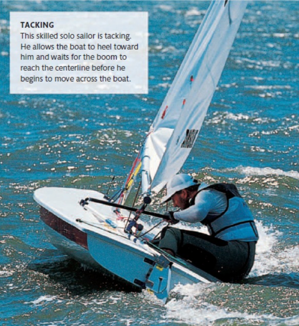 여기 능숙한 일인용 딩기의 선원은 태킹 중이다. 요트를 자기 쪽으로 기울게 하고, 붐이 센터라인에 오기를 기다린 다음, 건너편으로 넘어가기 시작할 것이다.