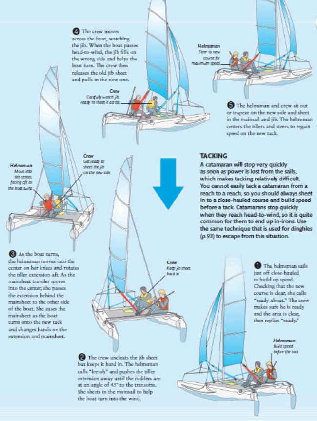 카타마란은 돛이 힘을 잃으면 매우 빨리 속도가 줄어들어서, 태킹이 상대적으로 힘들다. 리치에서 리치로 태킹하는 것은 쉽지 않으므로, 태킹 전에는 클로즈홀드 코스에서 쉬트를 당겨서 속도를 높여야 한다. 카타마란은 맞바람에서 금방 서기 때문에, 맞바람에 정지상태에 빠지는 경우가 흔하다. 이 상황에서 벗어나려면 딩기에서 쓰는 것과 같은 기술을 이용한다.