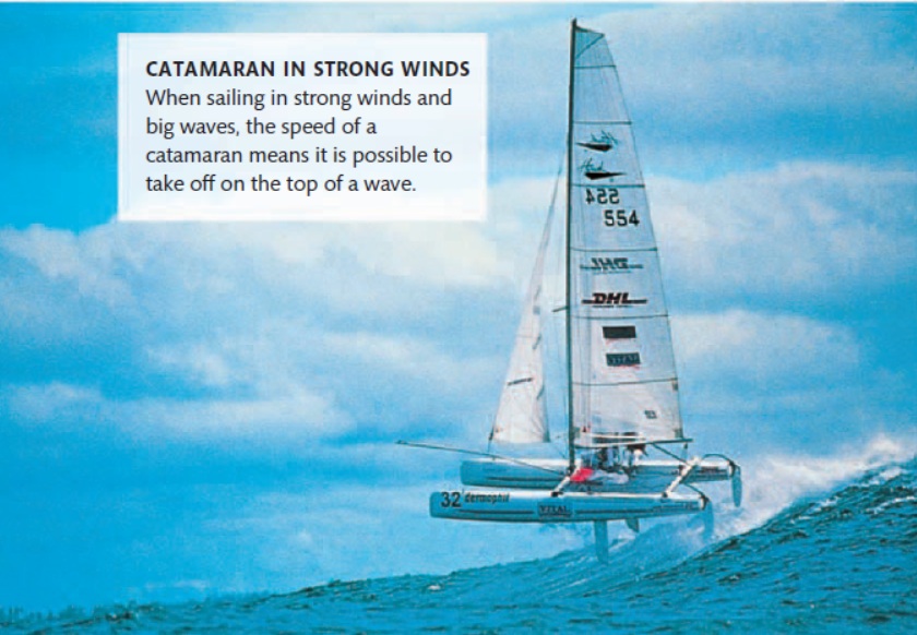 강풍과 큰 파도에서 항해할 때 카타마란의 속도는 파도 위를 나는 것도 가능하다.