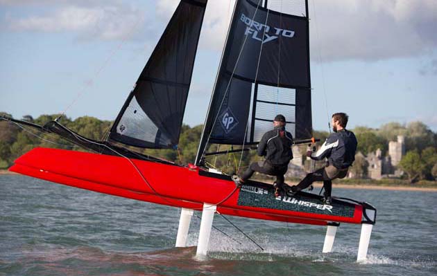 위스퍼 카타마란은 대거보드와 러더에 T형 포일을 장착했다. 4점 포일링 설정으로 항해한다.