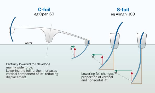 대거보드와 러더에 달리는 조정이 가능한 T포일은 멀티헐에 사용되는 일반적인 휜(curved) 대거보드보다 움직이는 부품이 더 많다. 단순한 C형 포일은 부분적인 양력만 주는 데, S형, L형 포일은 수면 밖으로 선체를 완전히 들 수 있다.